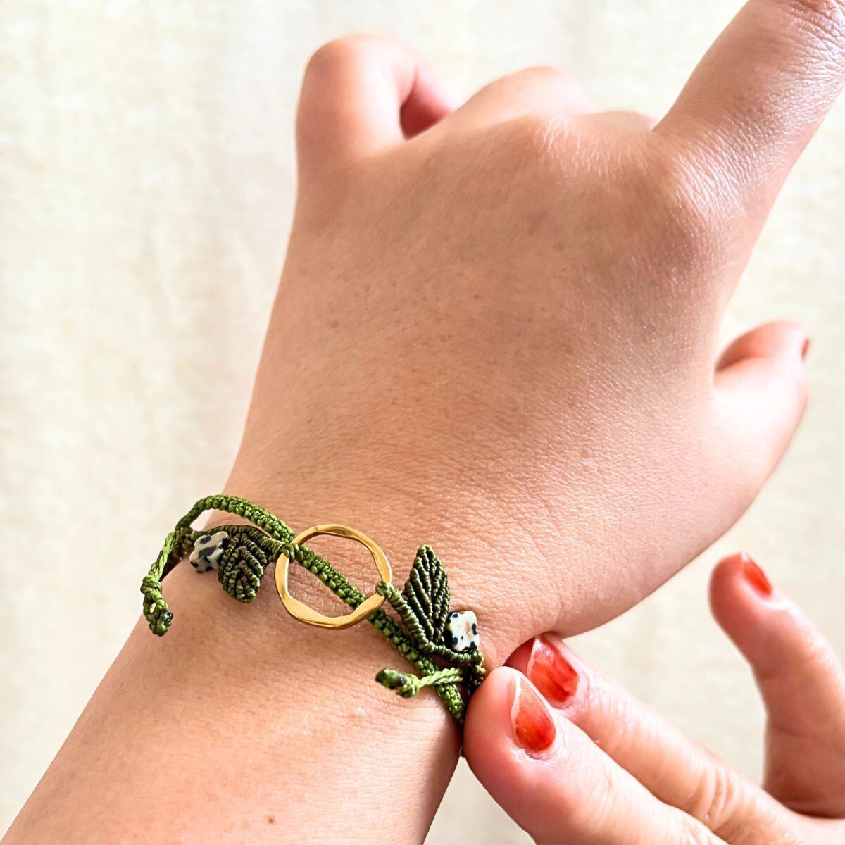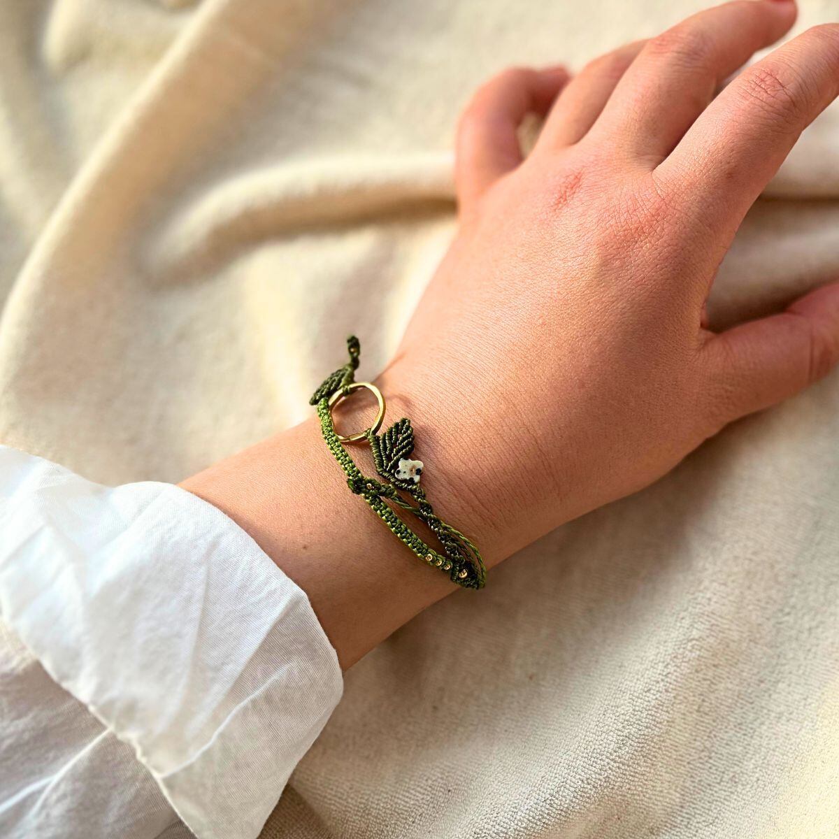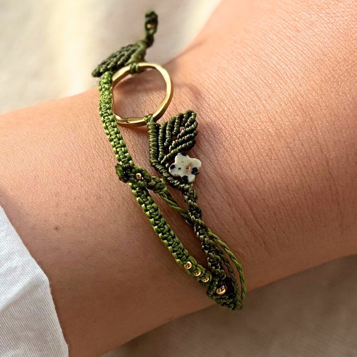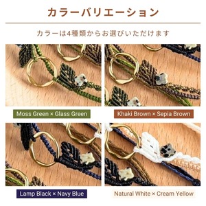 中央に配したラウンド型のゴールドカラーパーツを軸に、葉を思わせる立体的な編み模様で植物のかたちを表現しています。