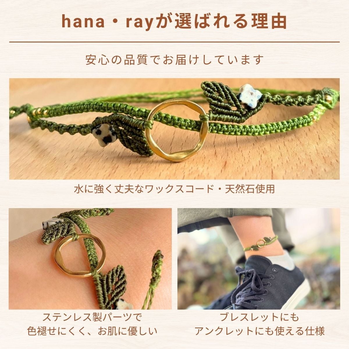 アジャスターを2個で設計しているため、手首への装着が難しい場面ではアンクレットとしてもお使いいただけます。