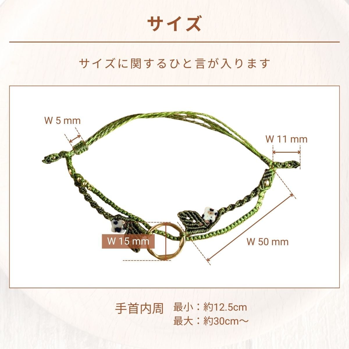 ・LINHASITA社製ワックスコードを使用しております。水や汗に強く比較的丈夫な素材ですが、使用に伴い色褪せ・色移り・ほつれ等の経年変化が生じます。