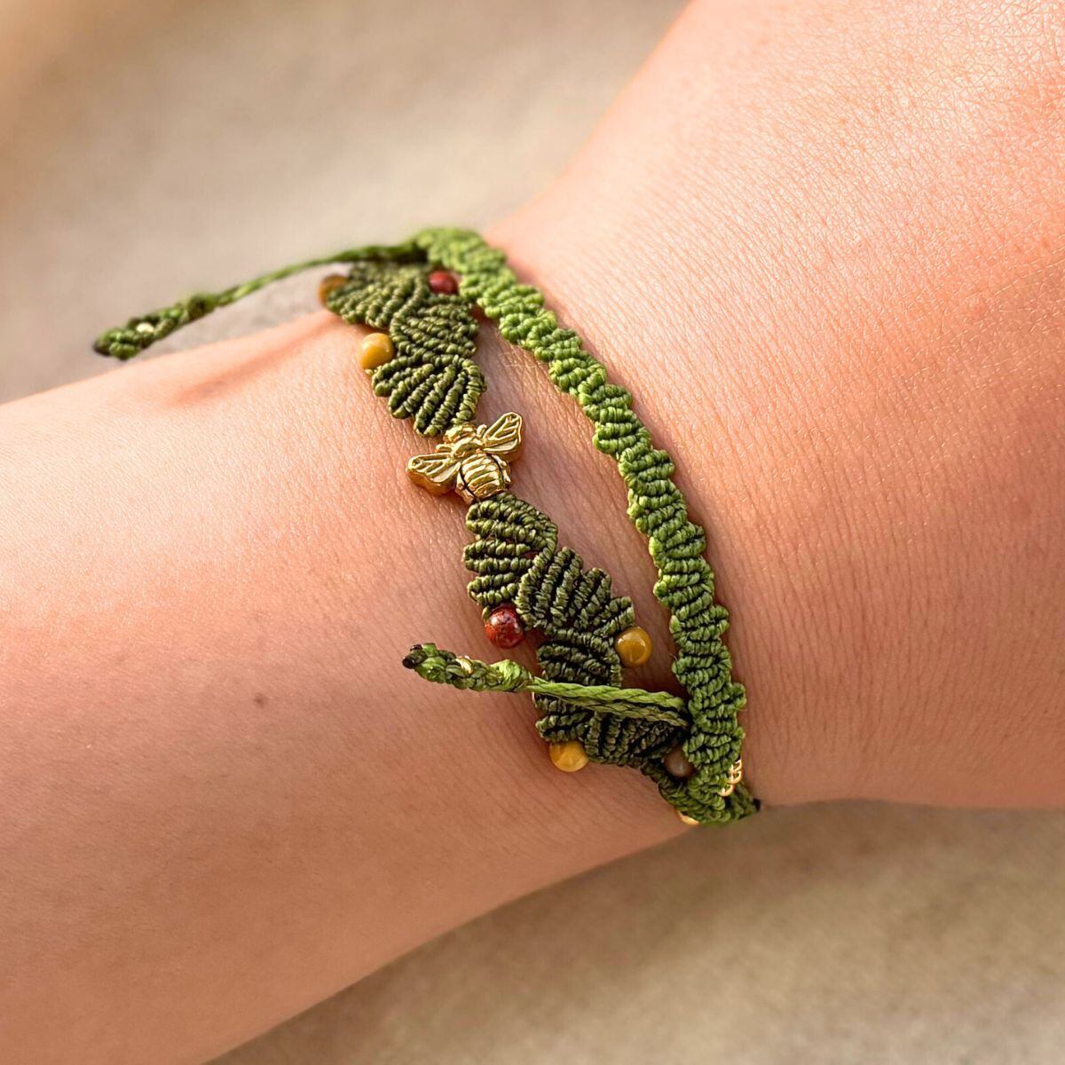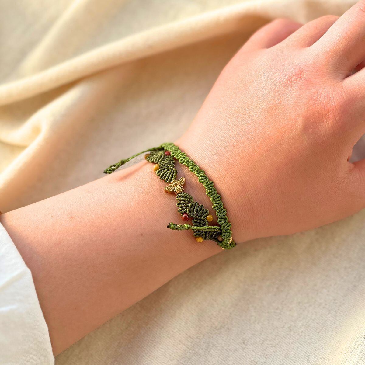 左右へと連なる葉の編み目のあいだを、そっと飛び交う一匹の蜂を思わせるデザインに仕上げました。