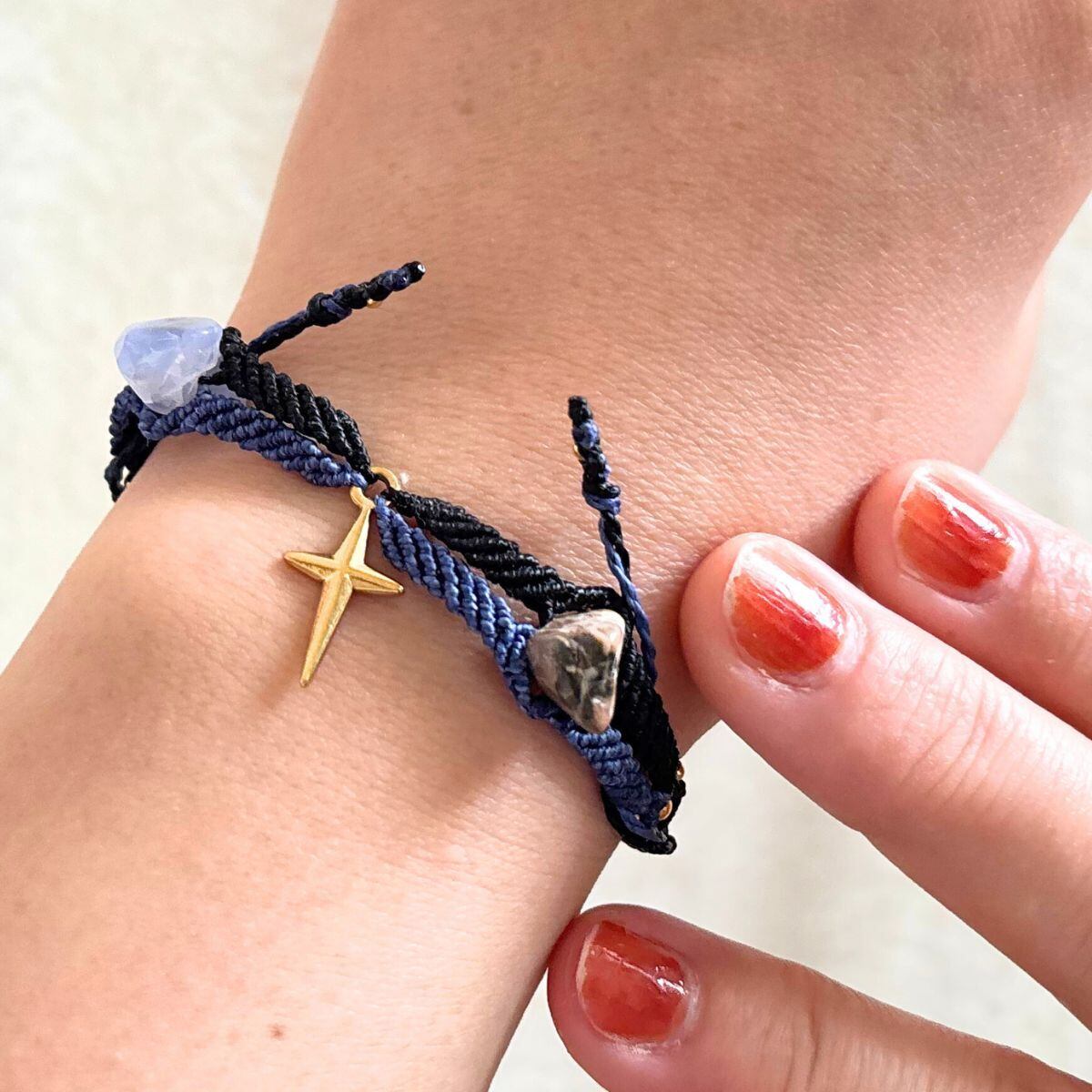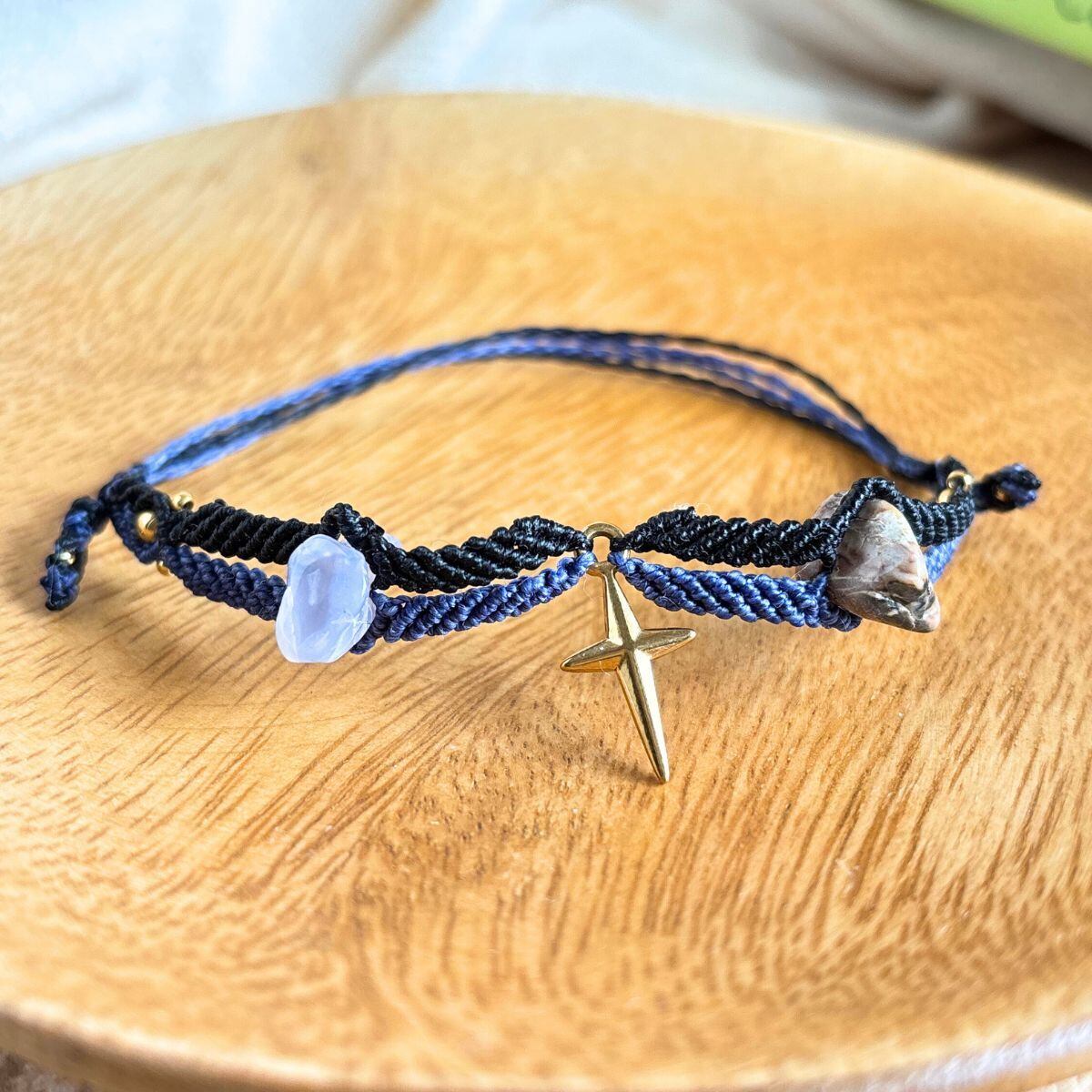 斜め編みのあいだには、約10mmの母岩付きタンブルのブルーカルセドニーをあしらいました。