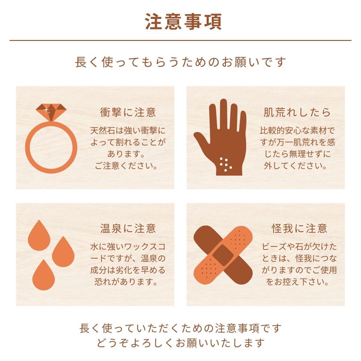 ・天然石は強い衝撃により破損する可能性があります。欠けやヒビが生じた場合はご使用をお控えください。